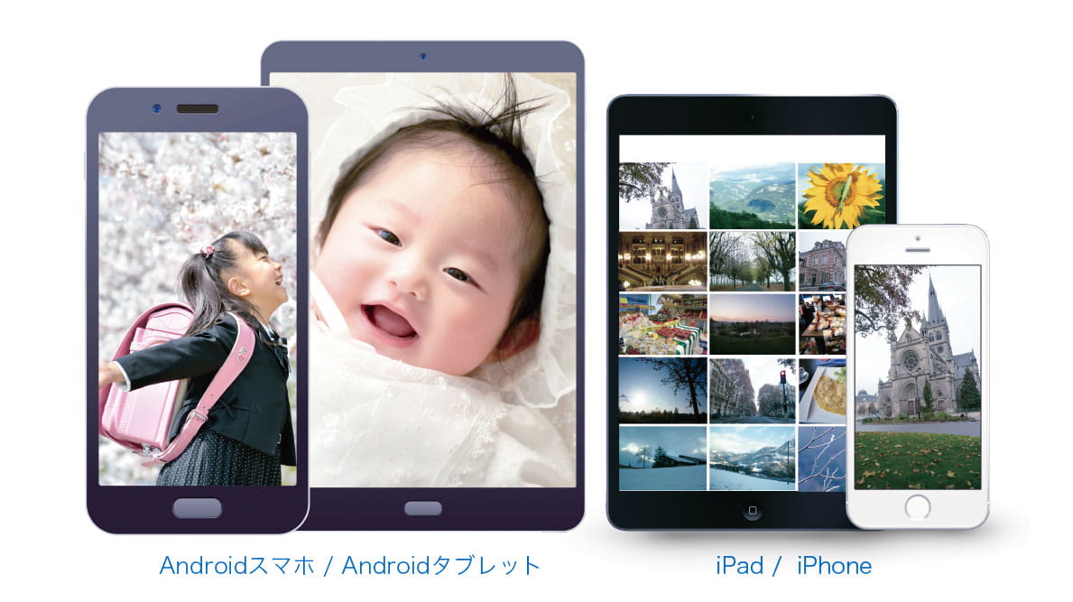 AOS Cloudは、異なるOS、別キャリア、複数端末に対応しています。iPhoneやAndroidの違うOSの2台以上のスマホや、ソフトバンク、au、ドコモなど別のキャリアのスマホやタブレットを持っていても、全てのデータを同じアカウントで管理することができます。