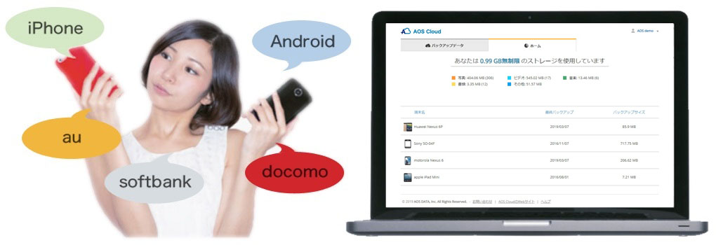 AndroidやiPhoneの大容量データは、クラウドバックアップアプリ「AOS Cloud」が無制限で管理します。あなたのスマホの大量コンテンツを容量は気にすることなく、クラウド上で全自動バックアップします。