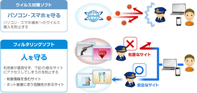 有害サイトや有害情報へのアクセスを防いで大切な子どもたちを守る「フィルタリングソフト」です。ウイルス対策ソフトがウイルス侵入の危険から「パソコン・スマホなどを守る」ものに対し、フィルタリングソフトとは、利用者が意図しないネットの危険にさらされるのを防ぐ、いわば「人を守る」ソフトです。