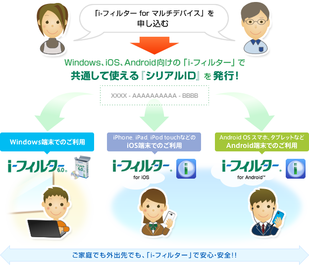 ご購入いただいたシリアルIDで、Windows、iOS、Android端末用のそれぞれの「i-フィルター」をそのままご利用いただける、複数端末用サービスが「i-フィルター for マルチデバイス」です。ご家庭でも外出先でもインターネット利用のあらゆるシーンで、お子さまの安全を見守ります!